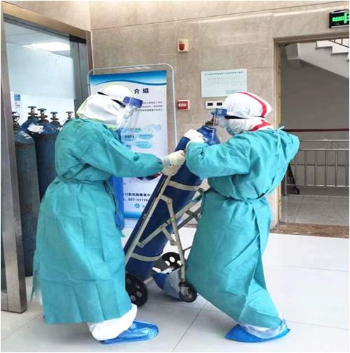 醫(yī)護(hù)人員搬運(yùn)笨重的氧氣瓶