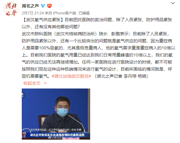 早在2月7日,武漢市肺科醫(yī)院院長彭鵬就曾表示,除了人員、防護(hù)用品緊張以外,還有一個(gè)突出問題就是氧氣供應(yīng)。