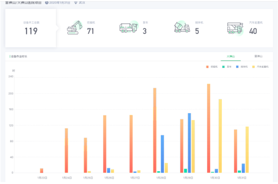 我們有一個產品叫應急裝備智能管理平臺,大家看到這個界面里面,我們統計有400多臺在我們平臺上的設備去支援了火神山、雷神山的建設,為武漢的抗疫做出了一定貢獻,這個柱狀圖是我們每天在火神山、雷神山施工實時的情況,而且在平臺的支持下也有效彌補現場服務工程師不足的問題。
