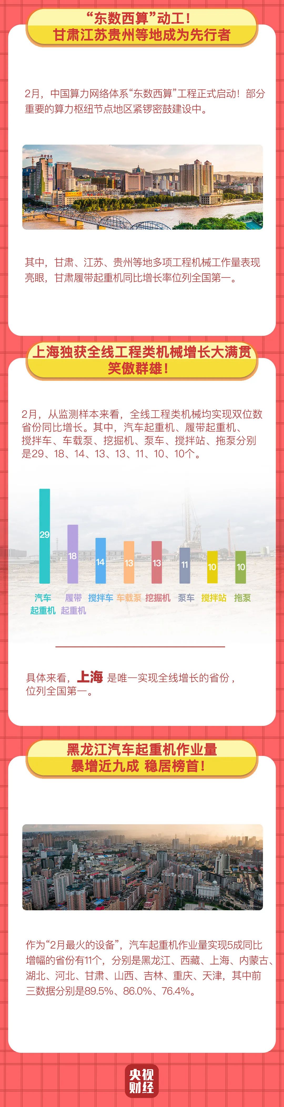 央視財(cái)經(jīng)挖掘機(jī)指數(shù)顯示,2月份,甘肅、江蘇、貴州多項(xiàng)工程機(jī)械作業(yè)量實(shí)現(xiàn)同比增長(zhǎng),其中甘肅多項(xiàng)工程機(jī)械作業(yè)量表現(xiàn)亮眼,履帶起重機(jī)同比增長(zhǎng)率位列全國第一。
