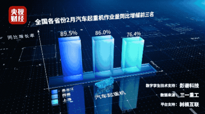 2月,汽車起重機(jī)作業(yè)量實(shí)現(xiàn)5成同比增幅的省份有11個(gè),分別是黑龍江、西藏、上海、內(nèi)蒙古、湖北、河北、甘肅、山西、吉林、重慶、天津,其中前三數(shù)據(jù)分別是89.5%、86.0%、76.4%,說明大部分省份在建工程進(jìn)度明顯加快。