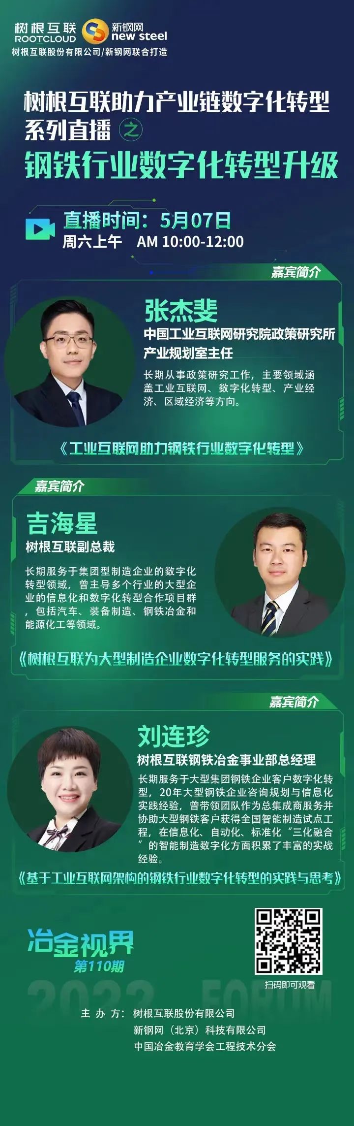 2022年5月7日,樹根科技聯合新鋼網舉辦助力產業鏈數字化轉型系列直播之“鋼鐵行業數字化轉型升級”活動,特邀數字化轉型專家們帶來鋼鐵行業的專業分享,歡迎各位關注參與本次線上直播活動。