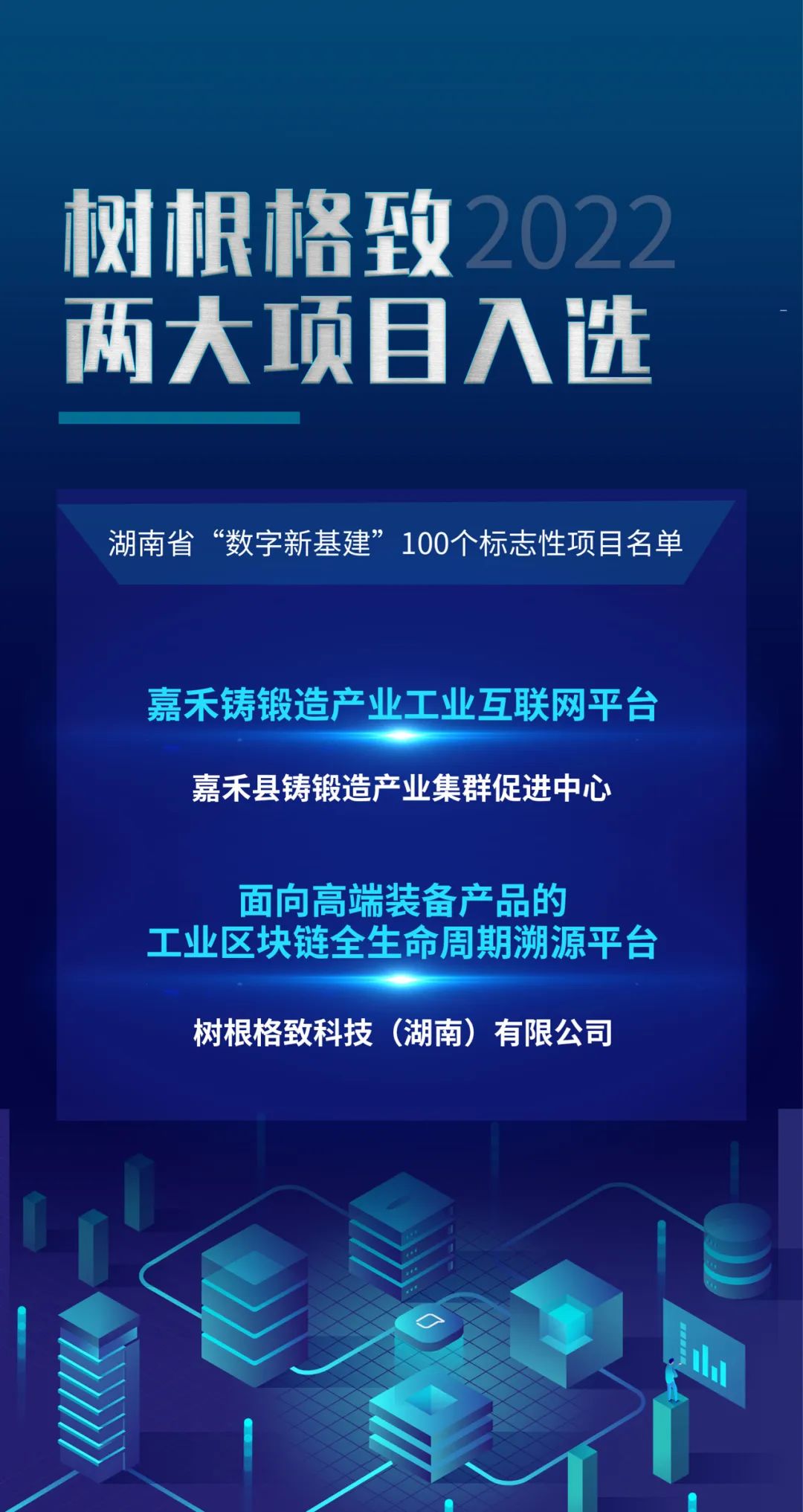 為全面落實“三高四新”戰略定位和使命任務,加快湖南省新型數字基礎設施建設《湖南省“數字新基建”100個標志性項目名單(2022年)》于5月23日正式公布,由樹根科技全國區塊鏈平臺總部公司——樹根格致打造的“面向高端裝備產品的工業區塊鏈全生命周期溯源平臺”項目,以及樹根格致服務項目“嘉禾鑄鍛造產業互聯網平臺”雙雙入選。