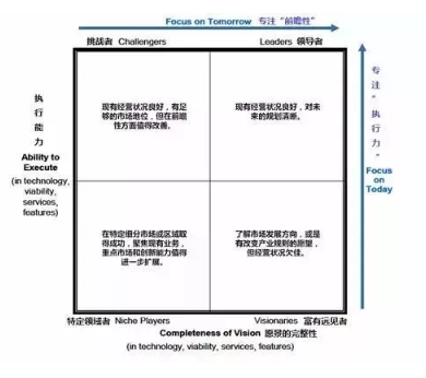 注釋:每年,Gartner都會就各個細分行業繪制相應的魔力象限圖。魔力象限一般有兩個軸,水平軸代表“愿景完整性”(Completeness of Vision),縱軸代表“執行能力”。因此,右上象限的稱為“領導者”(Leaders),右下象限是“遠見卓識者”(Visionaries),左下象限為“利基市場玩家”(Niche),左上象限為“挑戰者”(Challengers)。