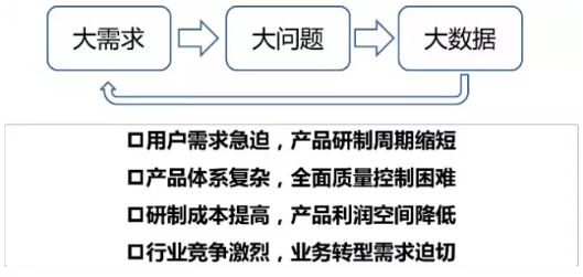 制造型企業(yè)面臨著客戶需求個(gè)性化,產(chǎn)品上市時(shí)間短,研制成本提高等巨大挑戰(zhàn)。這種挑戰(zhàn)本身更多體現(xiàn)在企業(yè)與企業(yè)之間如何以更低的成本、更高的質(zhì)量、更快的速度滿足客戶多樣的需求。所以傳統(tǒng)方式很難解決大數(shù)據(jù)時(shí)代的企業(yè)問(wèn)題,需要有創(chuàng)新的手段來(lái)解決。目前越來(lái)越多的企業(yè)通過(guò)大數(shù)據(jù)來(lái)驅(qū)動(dòng)業(yè)務(wù)創(chuàng)新,提升產(chǎn)品質(zhì)量、降低研制成本、加快上市周期。