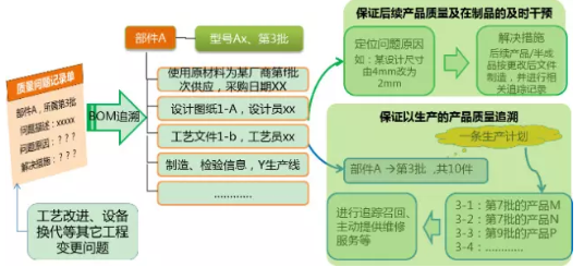 目標(biāo):可通過(guò)BOM集成管理的數(shù)據(jù),進(jìn)行產(chǎn)品問(wèn)題的向上及向下追溯,一方面追蹤問(wèn)題根源并對(duì)其影響范圍進(jìn)行確定(如存在多少在制品等)并干預(yù),保證后續(xù)產(chǎn)品的質(zhì)量;另一方面根據(jù)問(wèn)題根源,改進(jìn)原材料或設(shè)計(jì)工藝等,從根源上解決問(wèn)題,降低問(wèn)題重復(fù)帶來(lái)的損失。