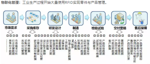 物聯(lián)化管理:工業(yè)生產(chǎn)過(guò)程開(kāi)始大量使用RFID實(shí)現(xiàn)零件與產(chǎn)品管理。