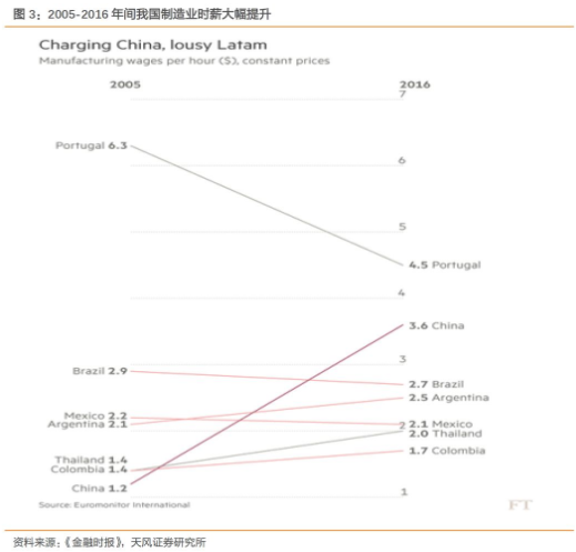 根據 Euromonitor International 的數據,中國制造業(yè)的時薪從 2005 年的 1.2$ 增長到 2016 年的 3.6$,已經超過了巴西、南非和印度,制造業(yè)成本的人口紅利已經結束,部分國際巨頭已經或者正在考慮將工廠外遷至泰國、孟加拉國等東南亞國家,我國制造業(yè)必將迎來巨大挑戰(zhàn)。