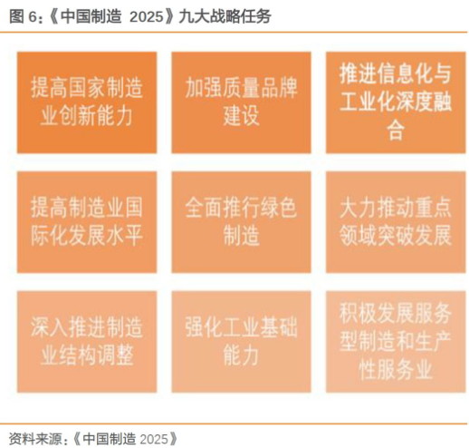 圍繞實現制造強國的戰(zhàn)略目標,《中國制造 2025》明確了 9 項戰(zhàn)略任務和重點,并明確提出,通過政府引導、整合資源,實施國家制造業(yè)創(chuàng)新中心建設、智能制造、工業(yè)強基、綠色制造、高端裝備創(chuàng)新等五項重大工程,實現長期制約制造業(yè)發(fā)展的關鍵共性技術突破,提升我國制造業(yè)的整體競爭力。