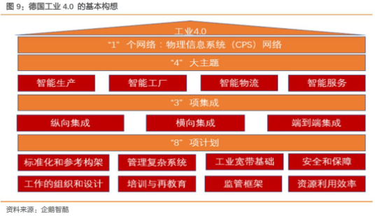 德國“工業(yè) 4.0”相當于美國的“工業(yè)物聯網”、中國的“中國制造 2025”。德國工業(yè) 4.0的戰(zhàn)略要點是建設一個網絡,研究四大主題,實現三項集成,實施八項計劃: