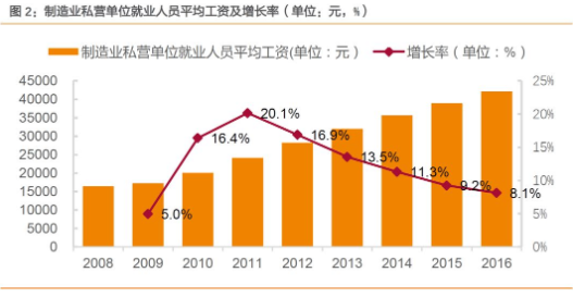 制造業(yè)薪酬大幅提高,制造業(yè)企業(yè)承壓明顯。隨著體力勞動適齡人口下降, 我們認為中國在未來將面臨體力勞動力短缺的狀況,制造業(yè)人員平均工資增長,人力成本上升,人口紅利隨之消失。2016 年制造業(yè)從業(yè)人員平均工資達到了 4.2 萬元/年,而生產人員的工資達到了將近 4.7 萬元/年,勞動力成本的持續(xù)上升已經成為企業(yè)的頭號挑戰(zhàn)。