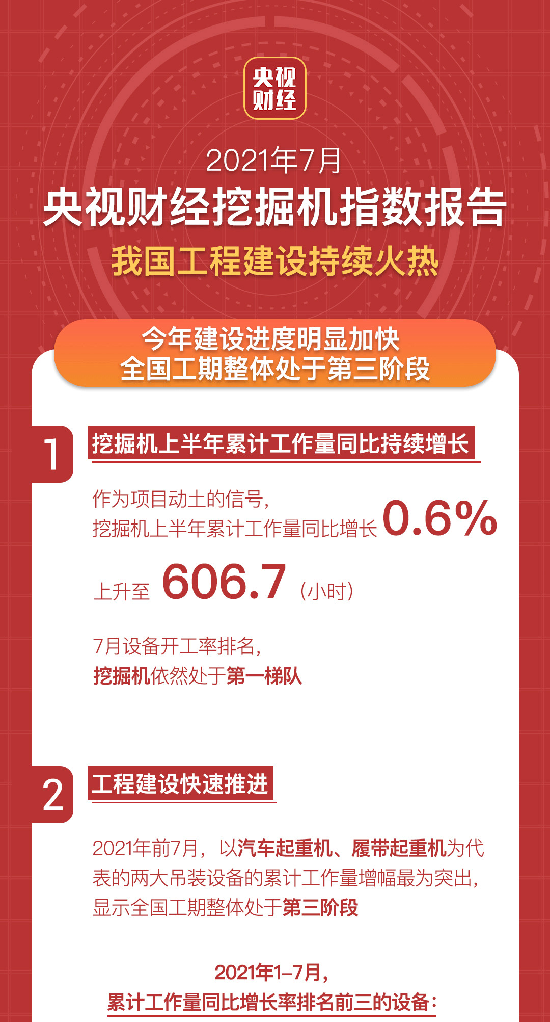 開工先動土,挖掘機作為各類工程建設開工的信號。央視財經(jīng)挖掘機指數(shù)顯示,為了應對疫情影響,各地加大基建穩(wěn)投資力度,新工程動土需求逐步釋放,去年以來挖掘機始終處于高開工率的狀態(tài),去年全年挖掘機的累計工作量同比大幅增長12.9%。今年上半年繼續(xù)保持穩(wěn)步增長態(tài)勢,2021年1到6月挖掘機累計工作量同比小幅上升0.6個百分點,從去年同期的603.2(小時)上升至606.7(小時)。