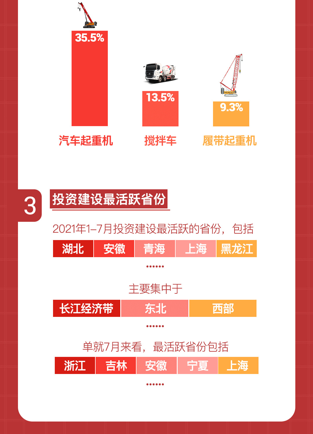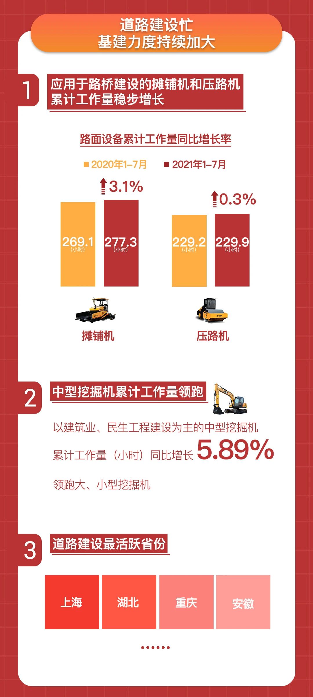 從開工率和作業(yè)時長來看,今年1到7月投資建設最活躍的區(qū)域,包括湖北、安徽、青海、上海、黑龍江等,主要集中于長江經(jīng)濟帶、東北、西部等地區(qū);單從7月來看,最活躍的區(qū)域包括浙江、吉林、安徽、寧夏、上海等。業(yè)內(nèi)人士表示,今年是十四五規(guī)劃的開局之年,隨著大量基建項目的陸續(xù)展開,預期下半年各類工程機械的開工率和作業(yè)時長會持續(xù)保持高位增長。