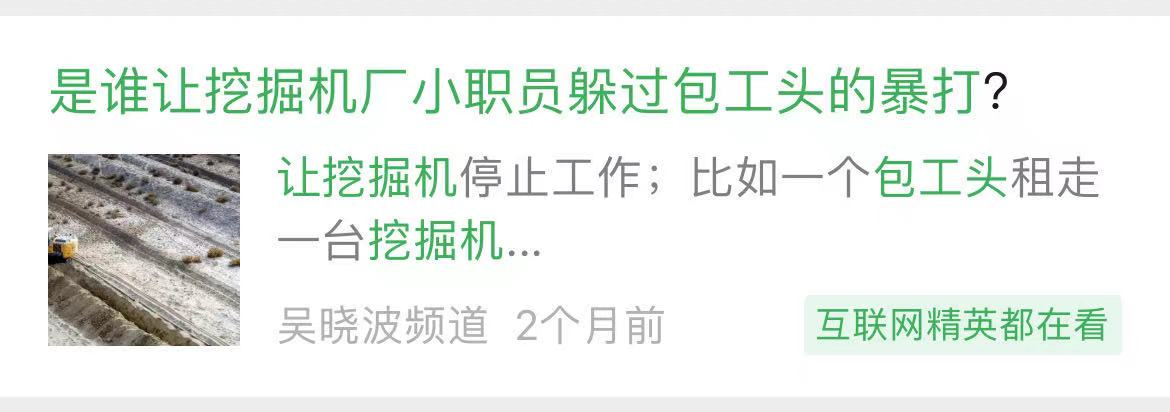 在吳曉波的舉例中,這樣兩難的處境,被形容成挖掘機(jī)小職員和包工頭的矛盾,生動形象地闡述出廠商、設(shè)備租賃方的被動與無奈,于是那篇《是誰讓挖掘機(jī)廠小職員躲過包工頭的暴打?》的文章,迅速在朋友圈擴(kuò)散開來。